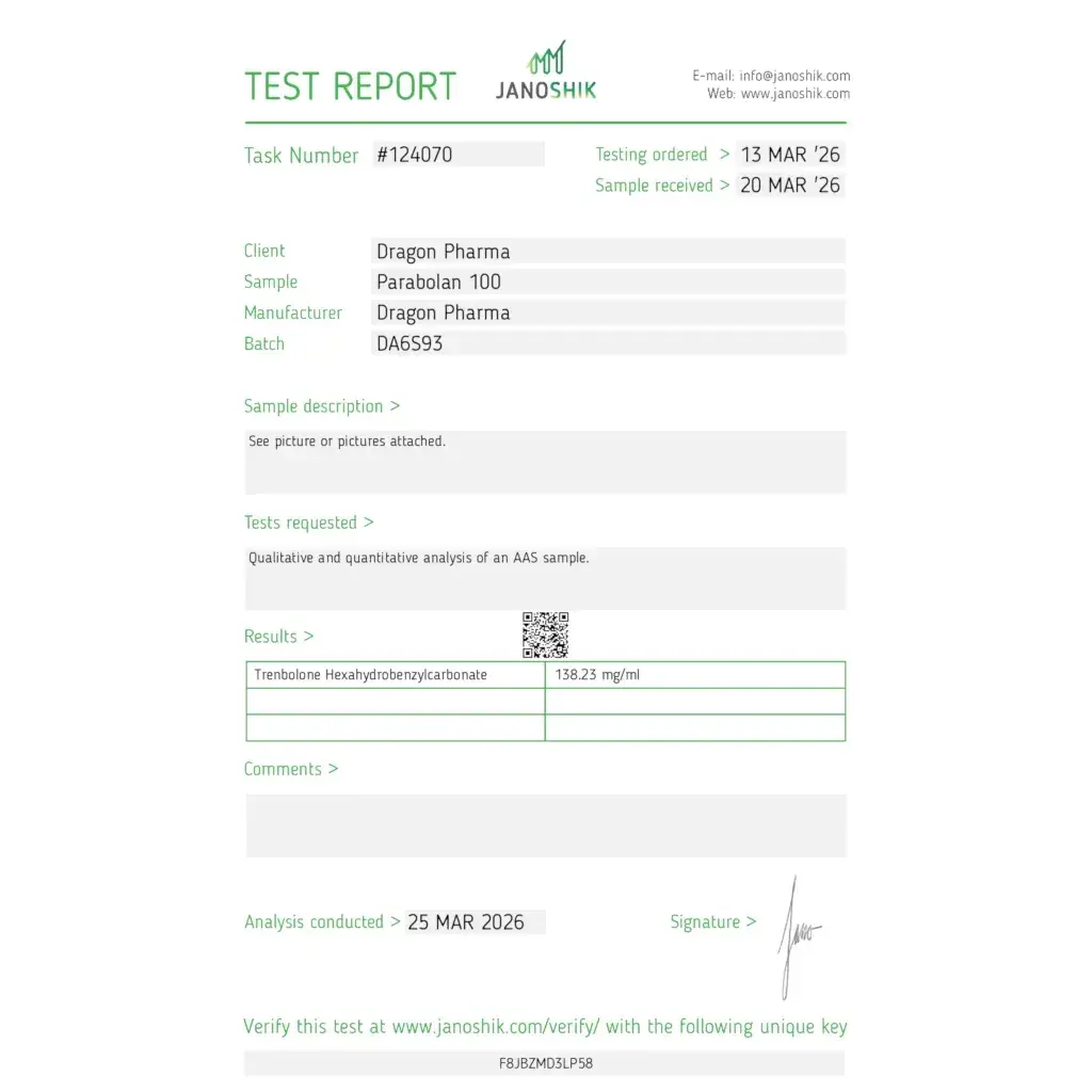 Manufacturer: Dragon Pharma Substance: Trenbolone Hexahydrobenzylcarbonate Pack: 10ml vial (100 mg/ml)Lab Tested: View Results